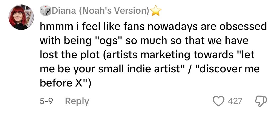 The mass claim to fame of being a ‘day one’ fan, though, is also happening within fandoms of artists who haven’t even asked for it. Songwriter Audrey Hobert recently released her debut single ‘Sue me’; many pieces introducing her, including this one from Cosmopolitan, refer to her as ‘Gracie Abrams’ best friend’ (not fan) or the sister of fellow singer Malcolm Todd - not, interestingly, as a singer-songwriter in her own right. As a result, fans of Abrams and Todd have flocked to Hobert’s single in droves, despite its spunky pop stylings being sonically exotic to Abrams’ folky fare and Todd’s indie-rock sensibilities. Many a TikTok have proudly proclaimed how they were a ‘day one’ fan of Hobert, but it raises interesting questions about the interest and dedication of the fanbase. Chief among them: how important will the status of being a ‘day one’ Hobert fan be if all you’re proving is your commitment to Abrams? (This isn’t to downplay the quality of the song itself; to my ear, it’s a decent, if unremarkable, debut single.)