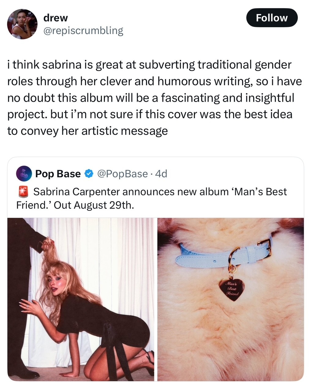 Carpenter isn’t setting feminism back fifty years, as some detractors might have you believe; in fact, I have every faith that the full Man’s Best Friend project will restore her penchant for thoughtful critique balanced with relatability and wit. Truly, my issue with her begins and ends with this cover. It is not Carpenter’s job to be the pinnacle of feminism, nor a perfect role model; her relatability when discussing the pitfalls of her dating life is part of why she’s become so beloved. (I’ve rarely felt so seen by a song as I have by ‘Slim Pickins’.) The problem here is that her imperfection has slipped dangerously into a error that undermines her usual sharpness, an error that unintentionally endorses the antithesis of Carpenter’s brand. For once, she’s not in on the joke.