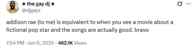 Listening back to ‘Obsessed’ now, it truly holds up: it’s a winkingly ironic self-empowerment anthem, whose camp qualities Rae would lean into further with future releases. The critics, though – supposedly swayed by their view of Rae as just another basic blonde girl – dismissed her. It wasn’t until 2022, when several of Rae’s demos leaked online, that different people started to embrace her for different reasons. She was no longer the white girl doing dances in a big house; now, she was singing on top of old Gaga demos and making properly good pop music. (In hindsight, it’s warming to consider that supporters of Rae’s early music were terminally online queers; I don’t doubt she felt a kinship with their otherness.) Bolstered by last year’s hit single, ‘Diet Pepsi’, she won over the public. All of a sudden, it was cool to like Addison Rae.